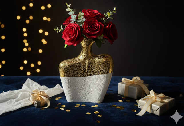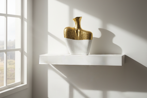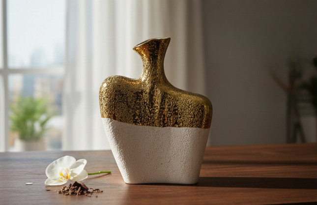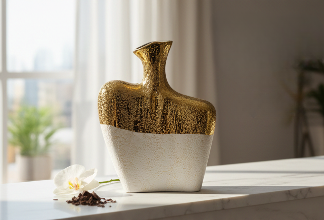 The Ember & Alabaster Vase is a masterpiece of elemental contrast, designed for those who appreciate the intersection of raw nature and refined luxury. This vessel captures the moment of a “golden horizon,” splitting the silhouette between a fiery, textured metallic and a calm, matte foundation.