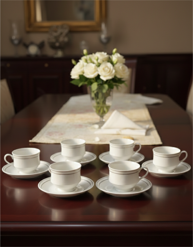 Coordinated Saucers: This complete set features matching ivory saucers, each designed with a dual-banded gold rim that frames the cup with a sophisticated architectural border.