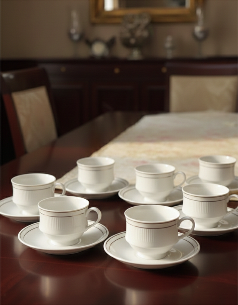 Refined Presentation: When staged on a dark wood table with white roses and neutral linens, the set serves as a brilliant focal point of “Modern Regency” style.
