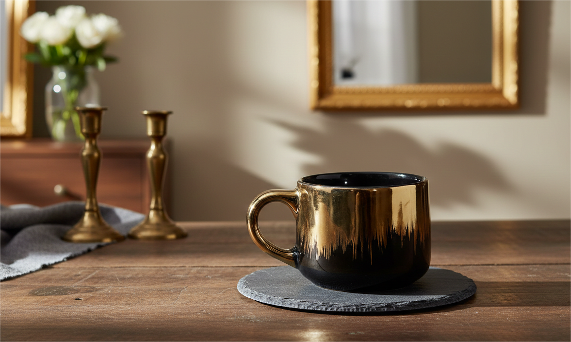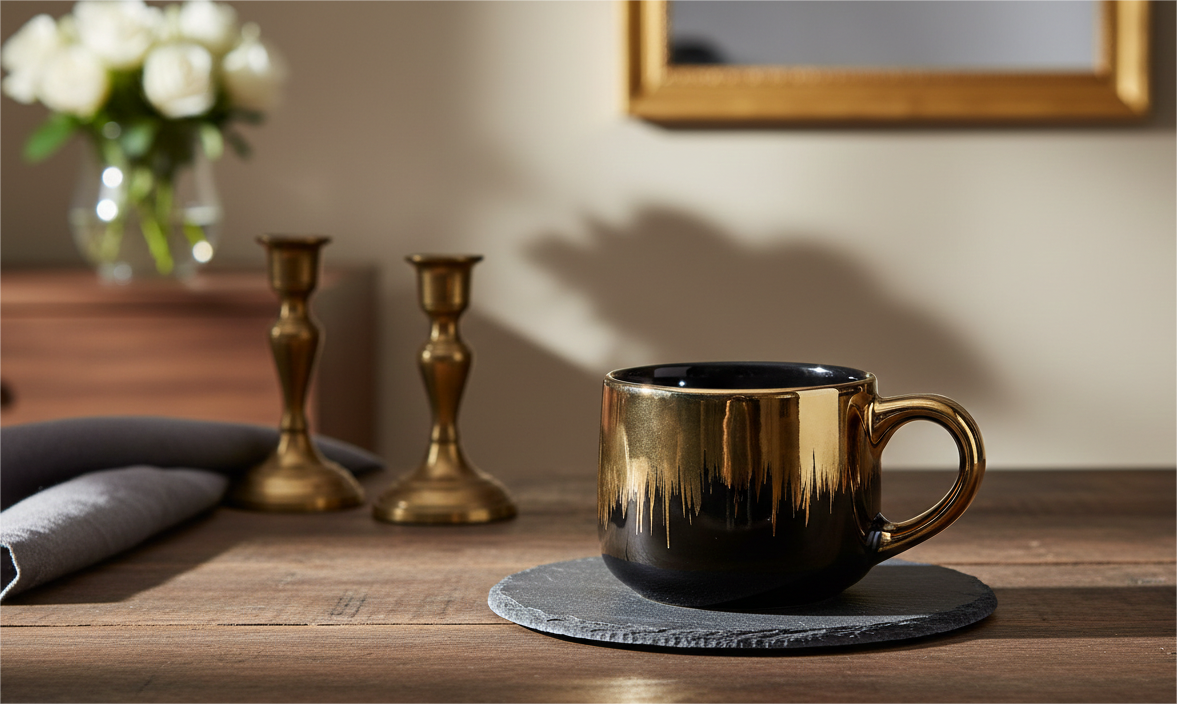 Reflective Brilliance: The polished metallic upper half catches and reflects ambient light, ensuring the set glows brilliantly against the dark wood of a dining table or the soft light of a candlelit room.