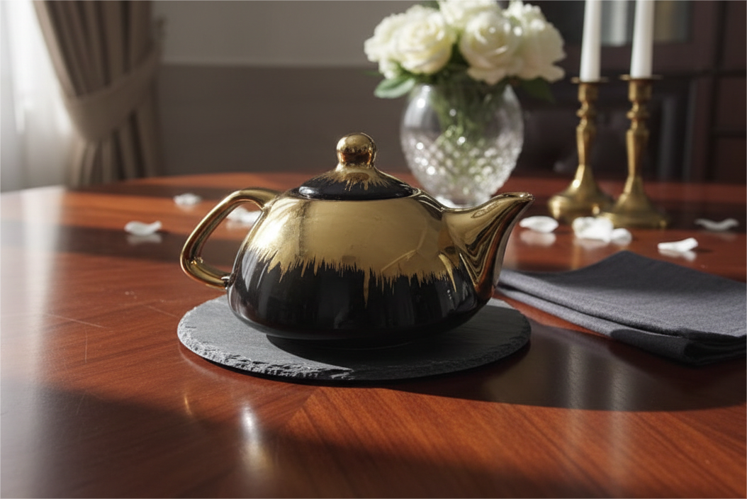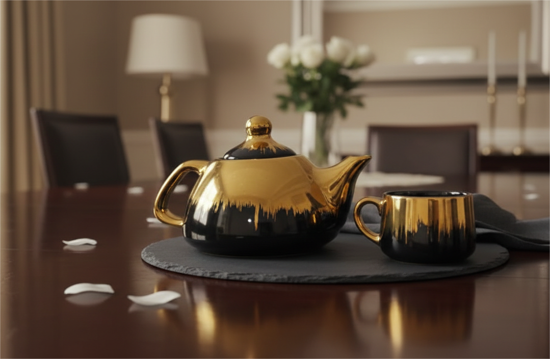 The Midnight Midas Tea Set is the definitive statement piece for the modern host, offering a masterclass in high-contrast luxury. This collection moves beyond traditional serveware, presenting an avant-garde aesthetic where deep, obsidian-like tones meet the radiant warmth of liquid gold. Each piece in this service is designed to command attention, turning a simple tea break into a dramatic, high-fashion ritual.
